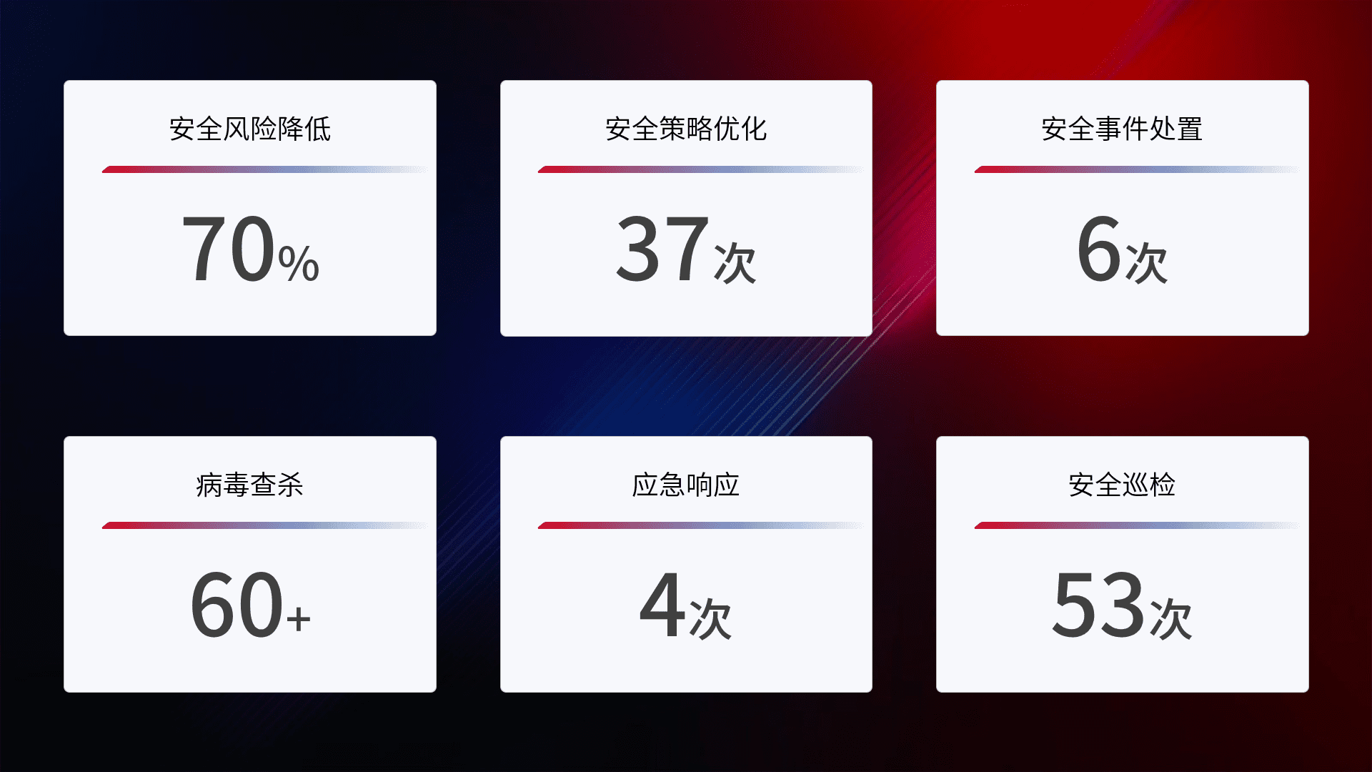 提供全面的安全事件报告体系,,,,包括处置报告、、周报、、、、季度和年度总结,,,结合持续监控,,,,帮助客户深入了解网络安全状况。。