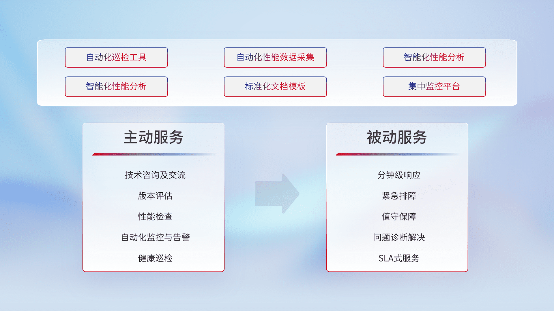 智能化工具和标准化文档,,,,保障服务质量,,,,提供主动服务(包含技术咨询、、版本评估、、、性能检查、、、、自动化监控与告警、、健康巡检)和被动服务包含(分钟级响应、、、、紧急排障、、值守保障、、、问题诊断解决、、、、SLA服务)。。。