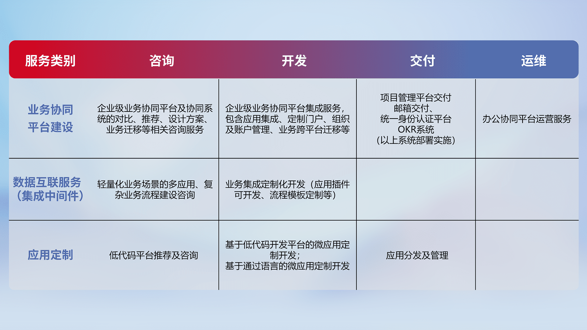 针对钉钉、、、、企微、、、IDaas等平台级产品提供产品的规划、、方案、、、、交付、、、定制化开发等服务,,,实现如统一协同办公、、、、智能客户服务、、、、混合会议管理、、智能数据查询、、等业务场景,,实现数字化转型。。。
